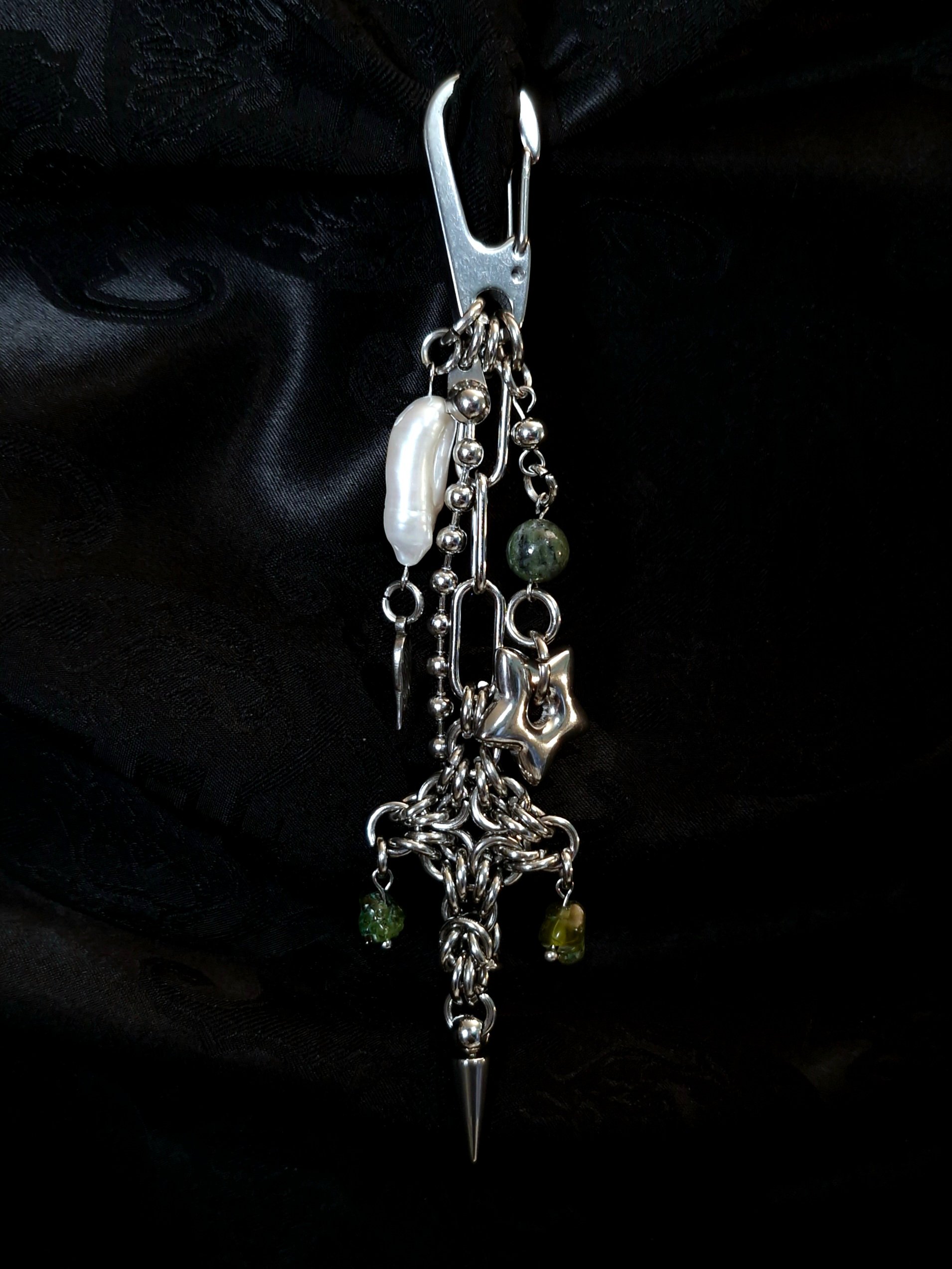Just the bag charm you've been looking for. Heavy chainmail cross pendant contrasted with a delicate white baroque freshwater pearl, peridot gemstones and jade bead.